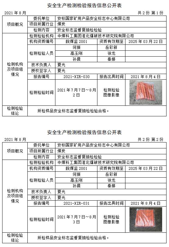 安全生產檢測檢驗報告信息公開表(2021年8月)