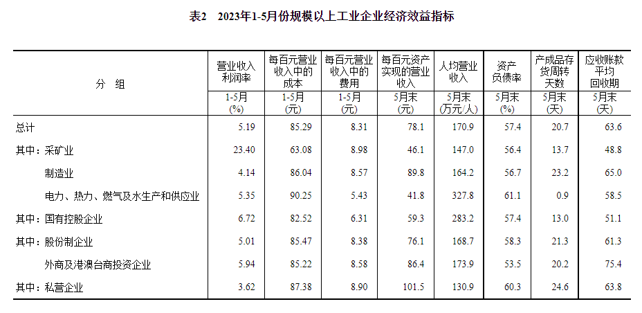 1—5月份,規(guī)模以上工業(yè)企業(yè)實(shí)現(xiàn)營業(yè)收入51.39萬億元,同比增長0.1%;發(fā)生營業(yè)成本43.83萬億元,增長1.2%;營業(yè)收入利潤率為5.19%,同比下降1.21個百分點(diǎn)。