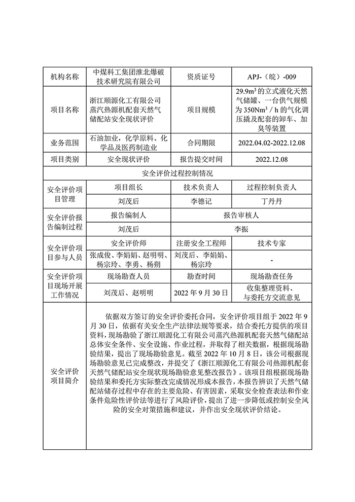 浙江順源化工有限公司 蒸汽熱源機(jī)配套天然氣儲配站安全現(xiàn)狀評價