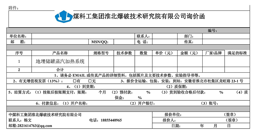 茲有中煤科工集團淮北爆破技術研究院有限公司科達分公司地埋儲罐蒸汽加熱系統(tǒng)采購項目需進行物資采購活動,現(xiàn)就儲罐蒸汽加熱系統(tǒng)采購進行公開詢價采購,請意向報價單位通過響應報價函(附件)書面形式進行報價,感謝積極支持!